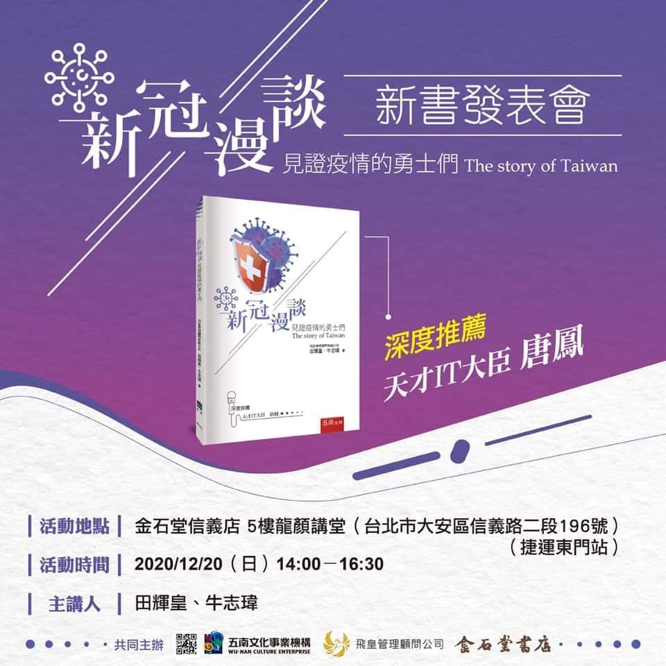 先生在本週日(12/20)下午2點為他的新書在捷運東門站的金石堂信義店辦理新書發表會,歡迎大家過去捧場,一起見證疫情的勇士們。